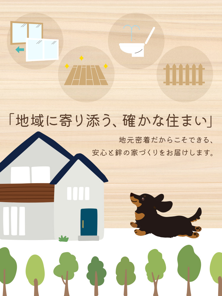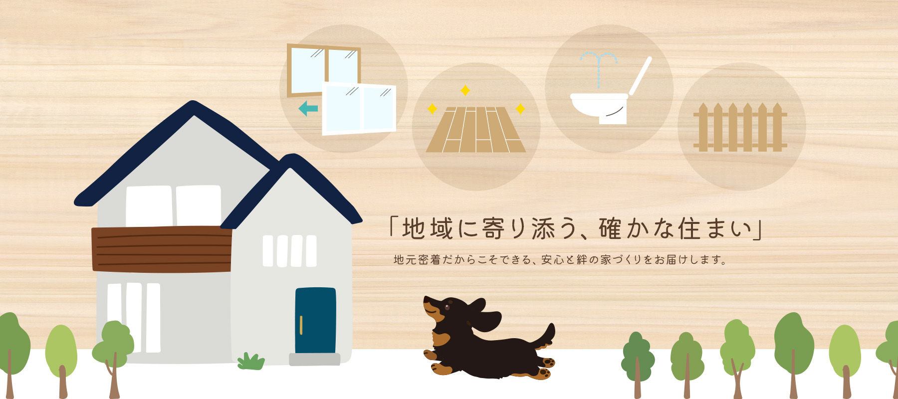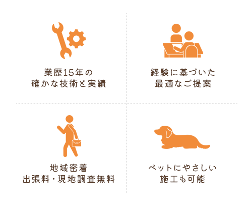 15年の経験に基づく確かな技術で、お客様に最適なリフォームをご提供します。 地域密着の工務店として、出張料・現地調査は無料。 ペットと暮らすご家庭にも配慮した施工ができます。